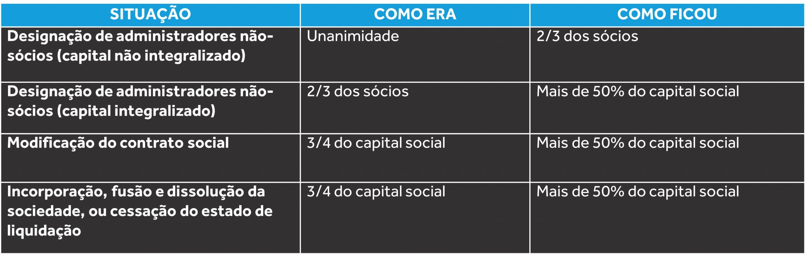 Dentre as alterações, temos a redução do quórum para designação de administradores não sócios; modificação do contrato social; e incorporação, fusão e dissolução da sociedade, ou cessação do estado de liquidação.