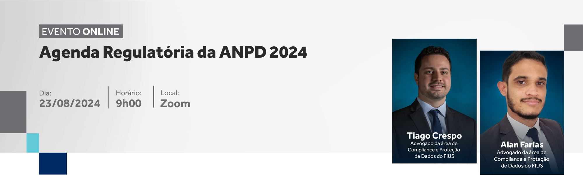 No dia 23/08 (sexta-feira) às 09h00, realizaremos o evento online “Agenda Regulatória da ANPD – 2024”, que contará com a participação de Tiago Crespo e Alan Farias – advogados da área de Compliance e Proteção de Dados do FIUS.