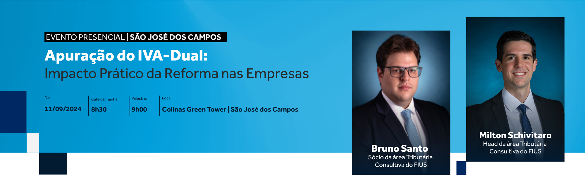 No dia 11/09 (quarta-feira) às 08h30, realizaremos em São José dos Campos o evento “Apuração do IVA-Dual: Impacto Prático da Reforma nas Empresas”, que contará com a participação de Bruno Santo – Sócio e Milton Schivitaro – Head, ambos da nossa área Tributária Consultiva.