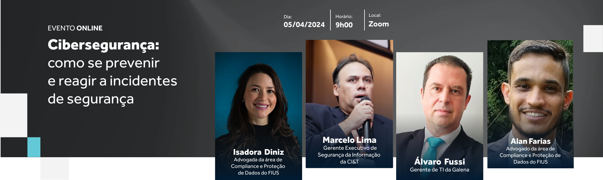 No dia 05/04 (sexta-feira), às 9h00, acontecerá o evento online “Cibersegurança: como se prevenir e reagir a incidentes de segurança”, com a participação de Álvaro Fussi – Gerente de TI da Galena, Marcelo Lima – Gerente Executivo de Segurança da Informação da CI&T, Alan Farias e Isadora Diniz – Advogados da nossa área de Compliance e Proteção de dados.