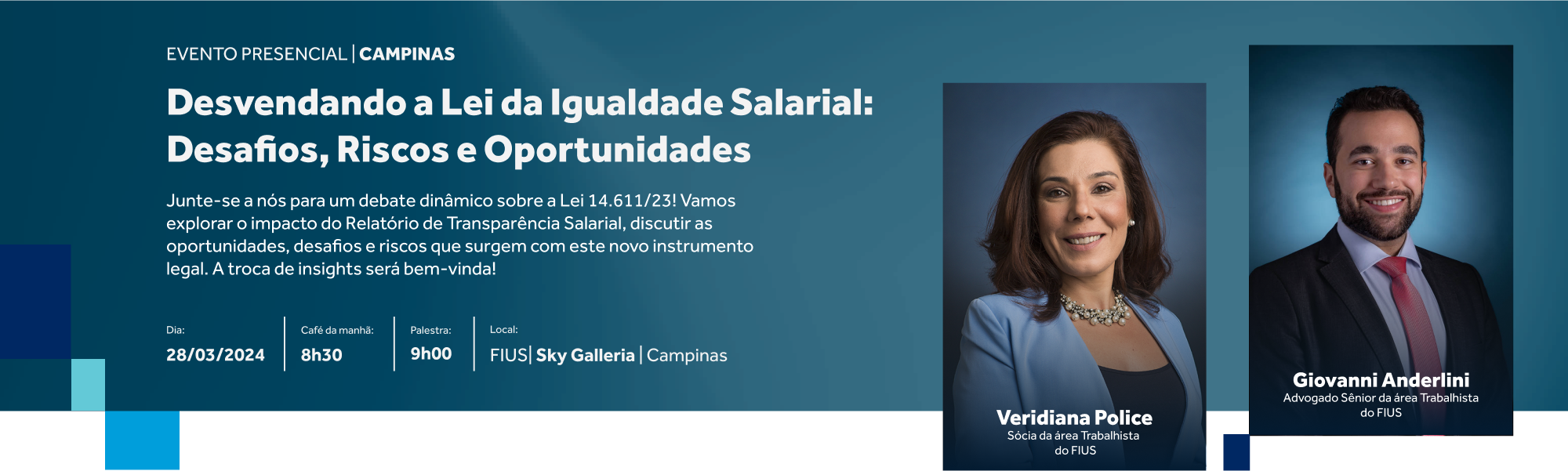 No dia 28/03 (quinta-feira) às 08h30, realizaremos em Campinas o evento “Desvendando a Lei da Igualdade Salarial: Desafios, Riscos e Oportunidades” com a participação de Veridiana Police, Sócia e Giovanni Anderlini, Advogado Sênior, ambos da nossa área Trabalhista.