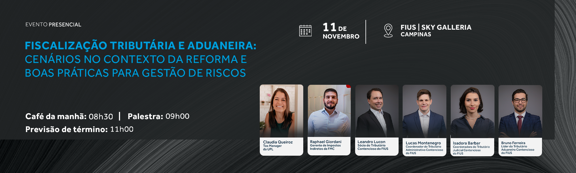 No dia 11/11 (terça-feira), às 8h30, realizaremos o evento: “Fiscalização Tributária e Aduaneira: Cenários no Contexto da Reforma e Boas Práticas para Gestão de Riscos”.