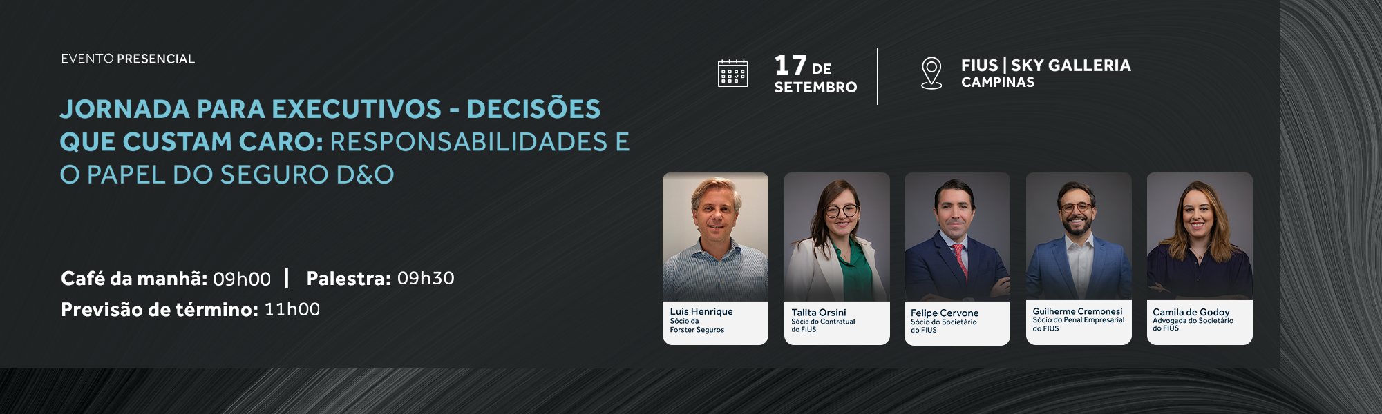 No dia 17/09 (quarta-feira), às 09h00, realizaremos o evento “Jornada Para Executivos – Decisões que Custam Caro: Responsabilidades e o Papel do Seguro D&O”.