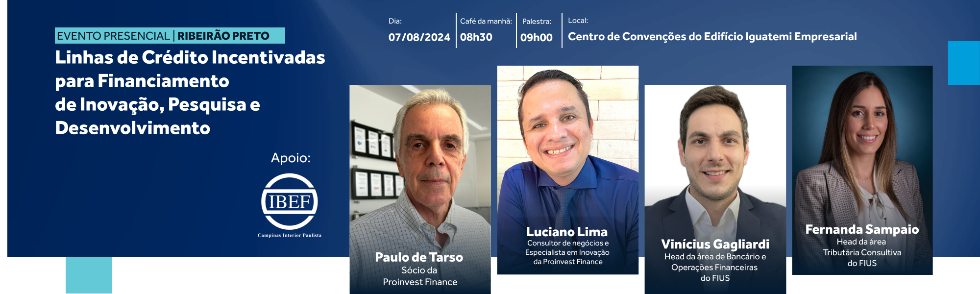 No dia 07/08 (quarta-feira) às 08h30, realizaremos em Ribeirão Preto o evento “Linhas de Crédito Incentivadas para Financiamento de Inovação, Pesquisa e Desenvolvimento”, que contará com a participação de Paulo de Tarso – Sócio da Proinvest Finance, Luciano Lima – Consultor de negócios e Especialista em Inovação da Proinvest Finance, Vinícius Gagliardi – Head da nossa área de Bancário e Operações Financeiras e Fernanda Sampaio – Head da nossa área Tributária Consultiva.