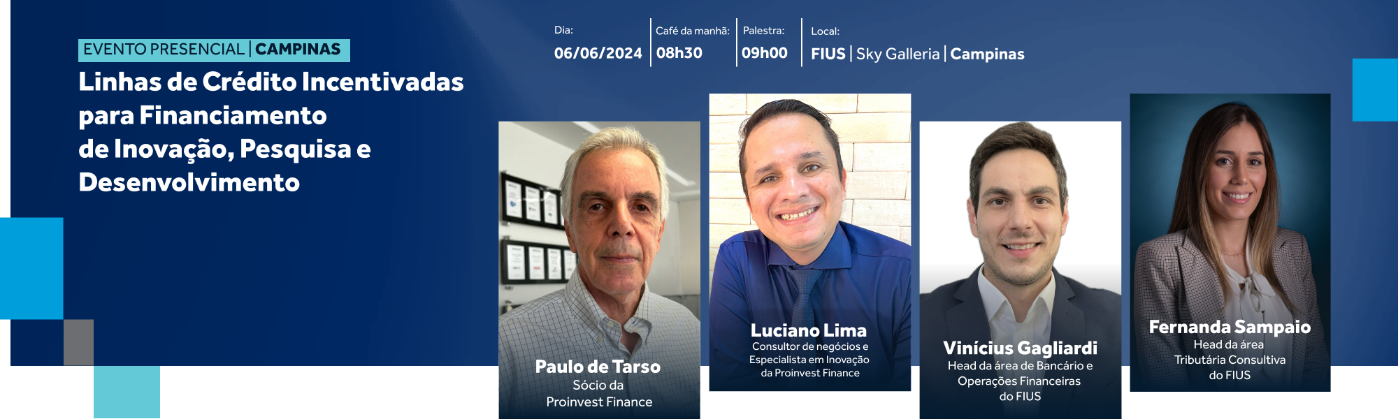 No dia 06/06 (quinta-feira) às 08h30, realizaremos em Campinas o evento “Linhas de Crédito Incentivadas para Financiamento de Inovação, Pesquisa e Desenvolvimento”, que contará com a participação de Paulo de Tarso – Sócio da Proinvest Finance, Luciano Lima – Consultor de negócios e Especialista em Inovação da Proinvest Finance, Vinícius Gagliardi – Head da nossa área de Bancário e Operações Financeiras e Fernanda Sampaio – Head da nossa área Tributária Consultiva.