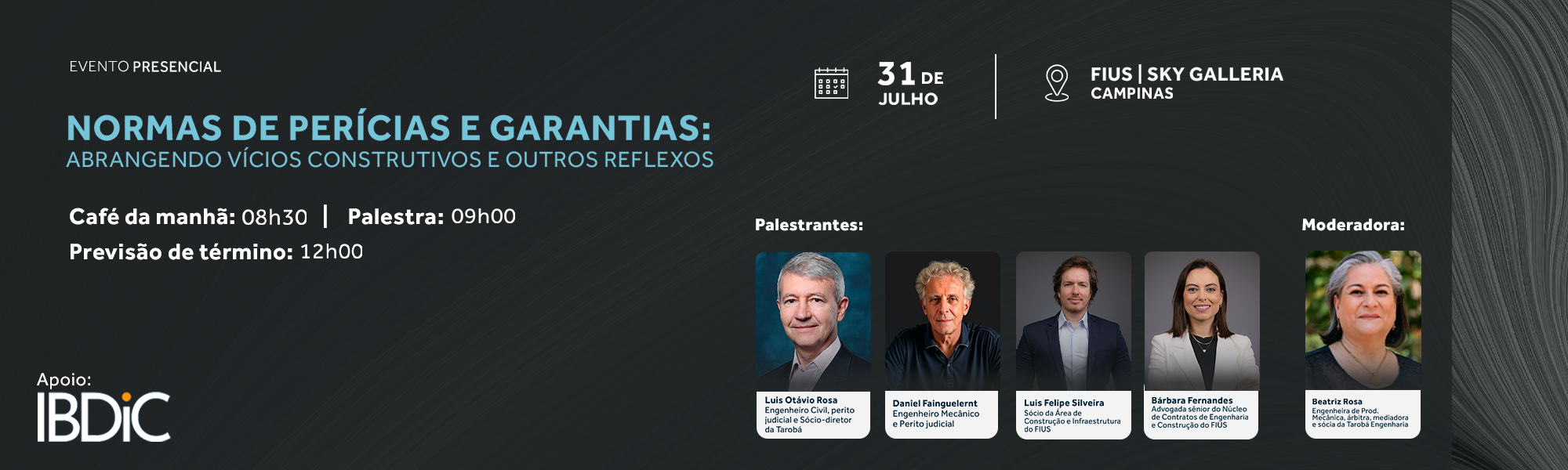 No dia 31/07 (quinta-feira) às 08h30, realizaremos o evento “Normas de Perícias e Garantias: Abrangendo Vícios Construtivos e Outros Reflexos”.
