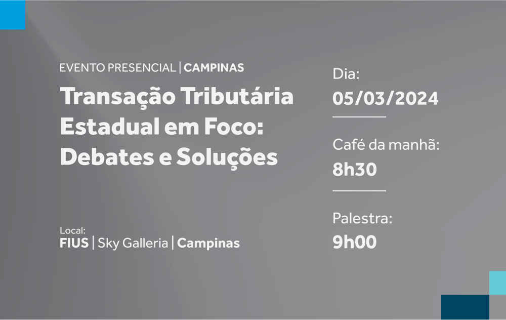 No dia 05/03 (terça-feira) às 08h30, realizaremos em Campinas o evento “Transação Tributária Estadual em Foco: Debates e Soluções”, com a participação de Pablo dos Santos – Chefe de SubProcuradoria