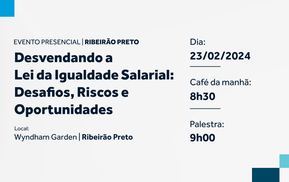 No dia 23/02 (sexta-feira) às 08h30, realizaremos em Ribeirão Preto o evento “Desvendando a Lei da Igualdade Salarial: Desafios, Riscos e Oportunidades”, com a participação
