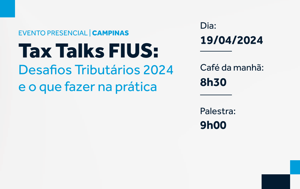 No dia 19/04 (sexta-feira) às 08h30, realizaremos em Campinas o evento “Tax Talks FIUS: Desafios Tributários 2024 e o que fazer na prática”, que contará com a