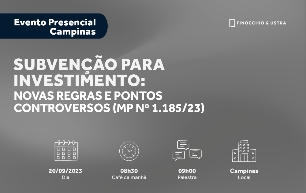 No dia 20/09 (quarta-feira) às 08h30, realizaremos o evento presencial “Subvenção para investimento: Novas regras e pontos controversos (MP nº 1.185/23)”, com a participação de Bruno Santo – sócio