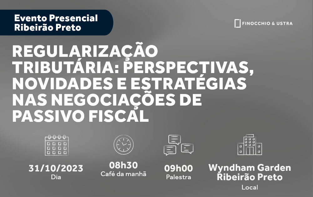 No dia 31/10 (terça-feira) às 08h30, realizaremos o evento presencial “Regularização Tributária: perspectivas, novidades e estratégias nas negociações de passivo fiscal”, com a participação de