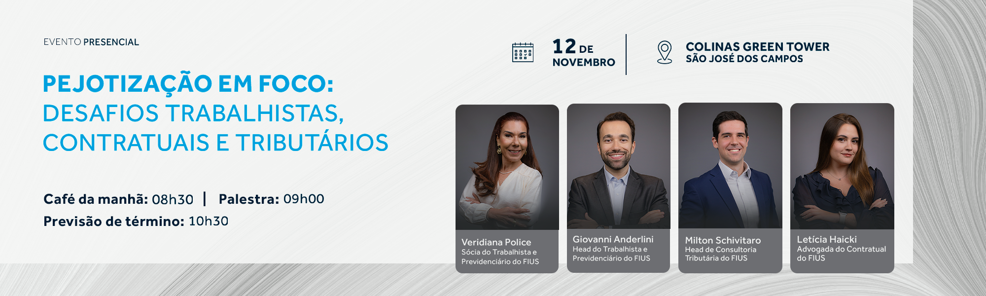 No dia 12/11 (quarta-feira), às 08h30, realizaremos o evento “Pejotização em Foco: Desafios Trabalhistas, Contratuais e Tributários”.