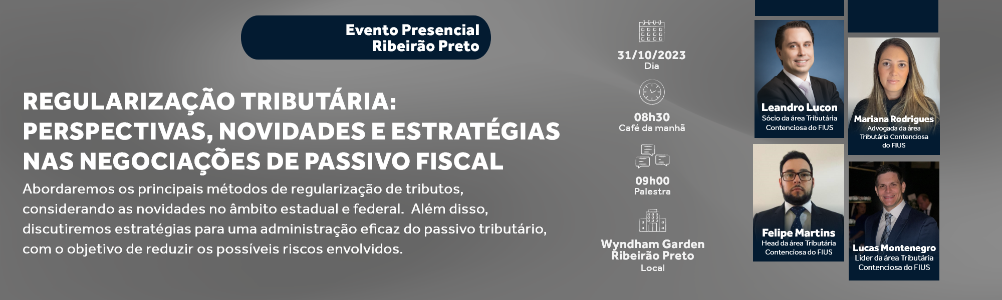 No dia 31/10 (terça-feira) às 08h30, realizaremos o evento presencial “Regularização Tributária: perspectivas, novidades e estratégias nas negociações de passivo fiscal”, com a participação de Leandro Lucon – sócio, Mariana rodrigues – advogada, Felipe Martins – head e Lucas Montenegro – líder, todos da nossa área Tributária Contenciosa.