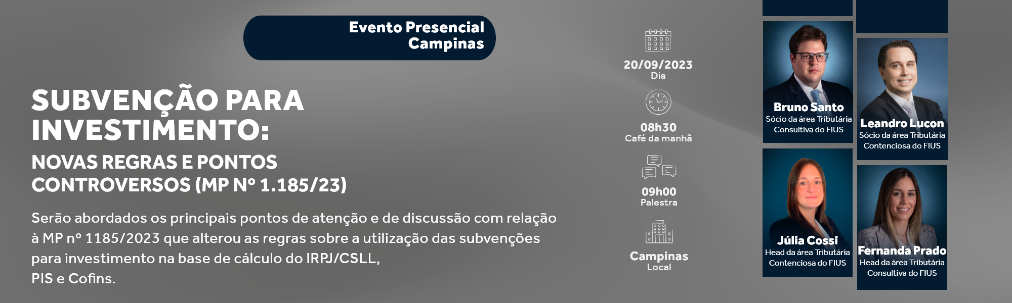 No dia 20/09 (quarta-feira) às 08h30, realizaremos o evento presencial “Subvenção para investimento: Novas regras e pontos controversos (MP nº 1.185/23)”, com a participação de Bruno Santo – sócio da nossa área Tributária Consultiva, Leandro Lucon – sócio da nossa área Tributária Contenciosa, Júlia Cossi – head da nossa área Tributária Contenciosa e Fernanda Prado – head da nossa área Tributária Consultiva.