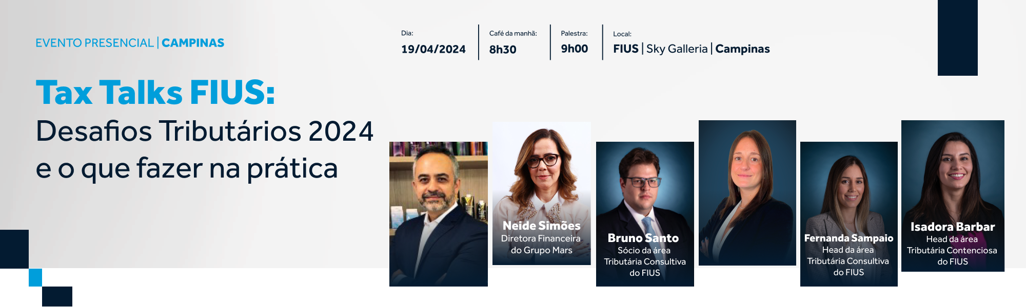 No dia 19/04 (sexta-feira) às 08h30, realizaremos em Campinas o evento “Tax Talks FIUS: Desafios Tributários 2024 e o que fazer na prática”, que contará com a participação de Rogério Araújo – Head de Tax da Tetrapak, Neide Simões – Diretora Financeira do Grupo Mars, Bruno Santo – Sócio, Fernanda Sampaio – Head, ambos da nossa área Tributária Consultiva, Julia Cossi – Head e Isadora Barbar – Head, ambas da nossa área Tributária Contenciosa.