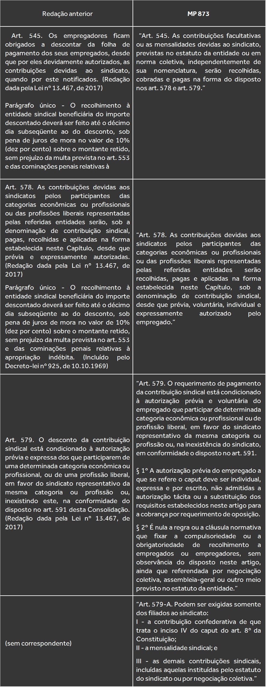 Elaboramos um quadro comparativo do antes e depois da Medida Provisória nº 873, de 1º de março de 2019, que alterou dispositivos da CLT e da Lei nº 8.112/90. Confiram: