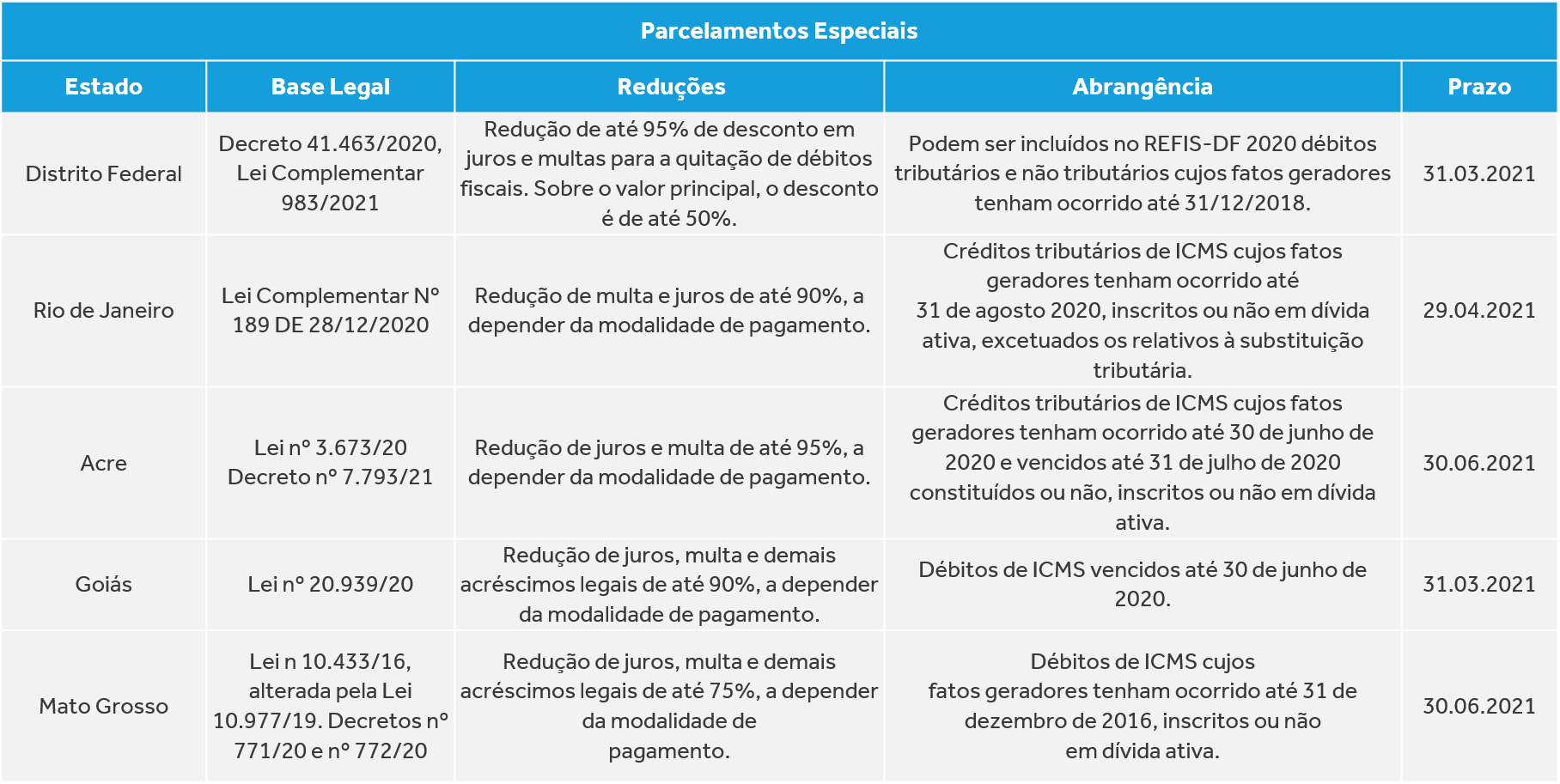 Os Estados do Amazonas, Pernambuco e Mato Grosso do Sul já disponibilizaram seus “parcelamentos especiais”, os quais, entretanto, tiveram seus prazos encerrados em fevereiro de 2021, e aguardam eventual renovação.