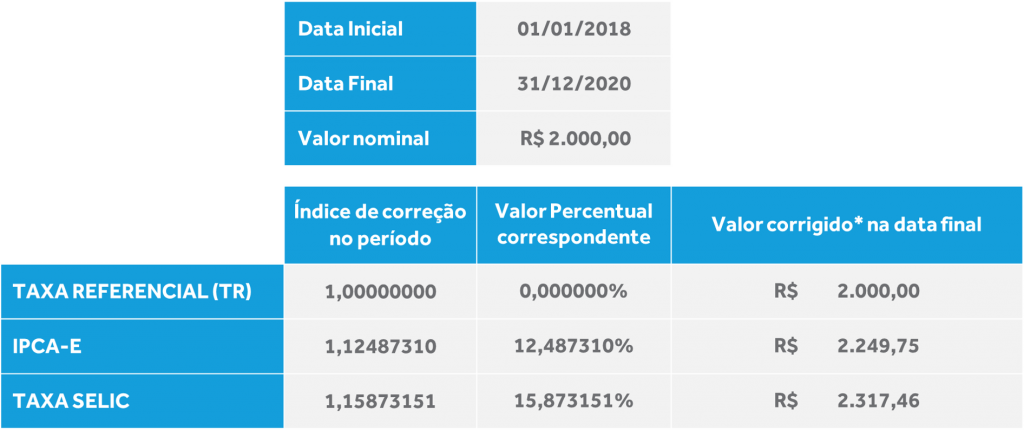 A fim de demonstrar o quanto pontuado pelos Ministros, o quadro sinótico abaixo aponta a diferença dos índices aplicáveis a um valor fixo dentro de um período de 2 (dois) anos e o resultado final dos valores a serem pagos nas hipóteses de suas utilizações.