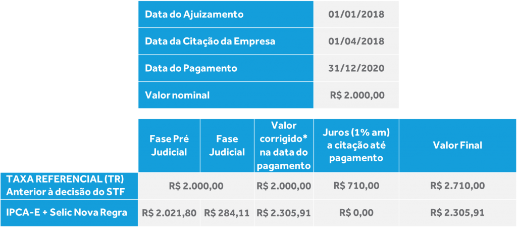 E, para melhor compreensão da diferença dos valores a serem pagos em razão da decisão da Suprema Corte, segue exemplo prático do valor final devido, em caso hipotético de uma Reclamação Trabalhista ajuizada em 01/01/2018, cuja citação ocorreu em 01/04/2018 e o pagamento do débito, em 31/12/2020.