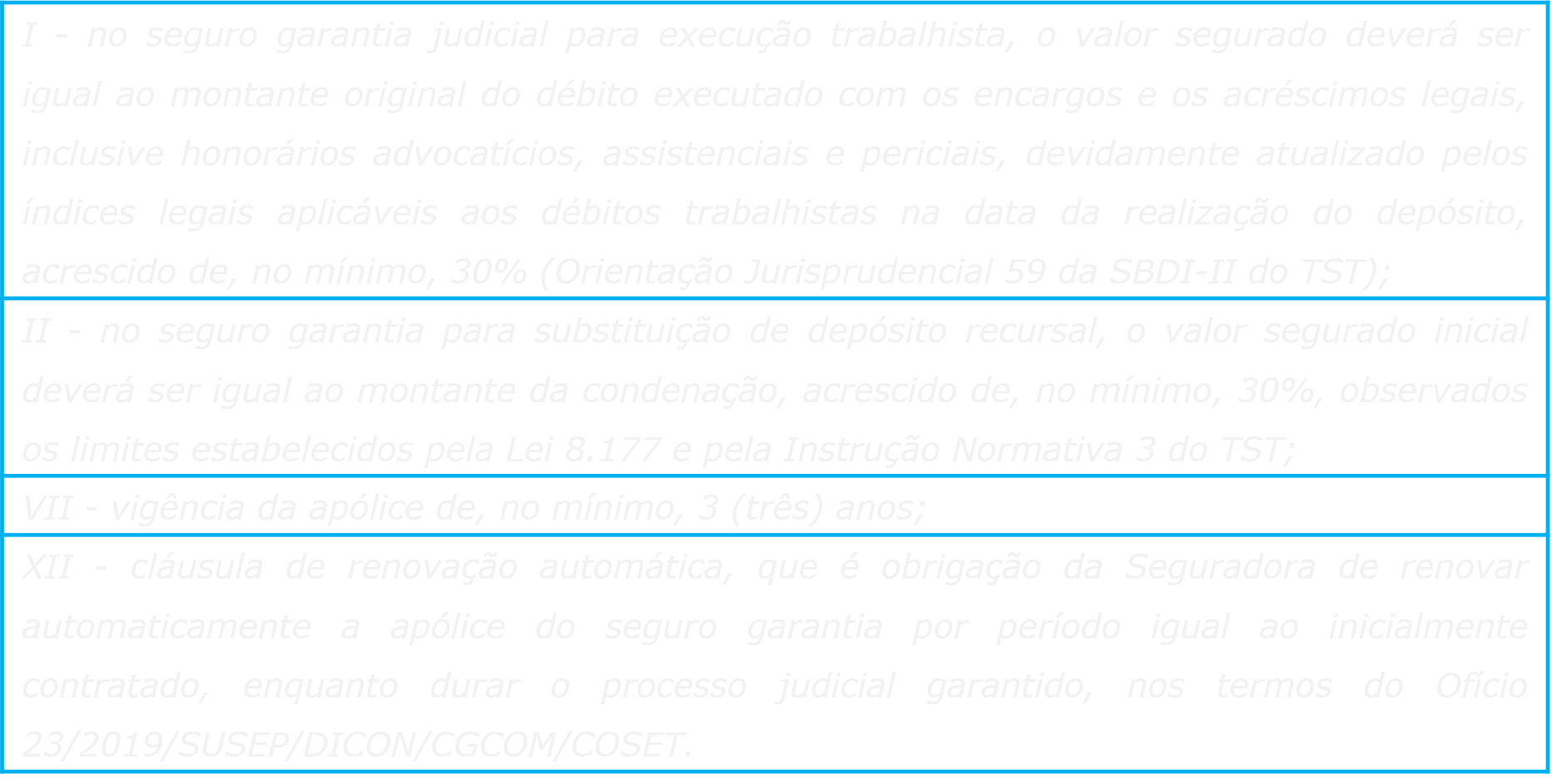 Por meio do Ato Conjunto nº 1 TST.CSJT.CGJT, a aceitação do seguro garantia judicial e da fiança bancária fica condicionada à observância de determinados requisitos, que deverão estar expressos nas cláusulas da respectiva apólice, dentre os quais destacamos os seguintes: